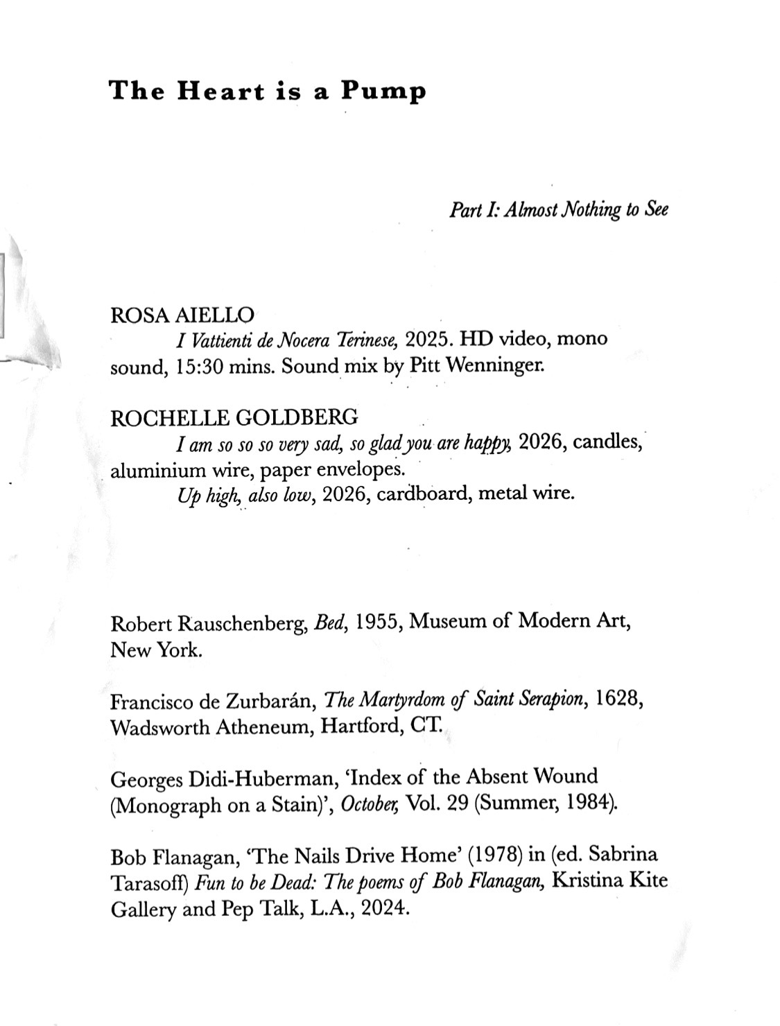 The Heart is a Pump is an exhibition project that takes its name after a poem by Bob Flanagan. It evolves across three parts with attending film screenings and conversations, exploring the motifs of pain, repetition and submission in Christian iconography and beyond.